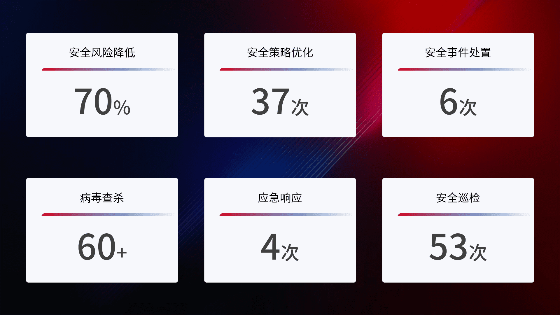 提供全面的安全事件报告体系,,,包括处置报告、、周报、、、、季度和年度总结,,,结合持续监控,,,,帮助客户深入了解网络安全状况。。