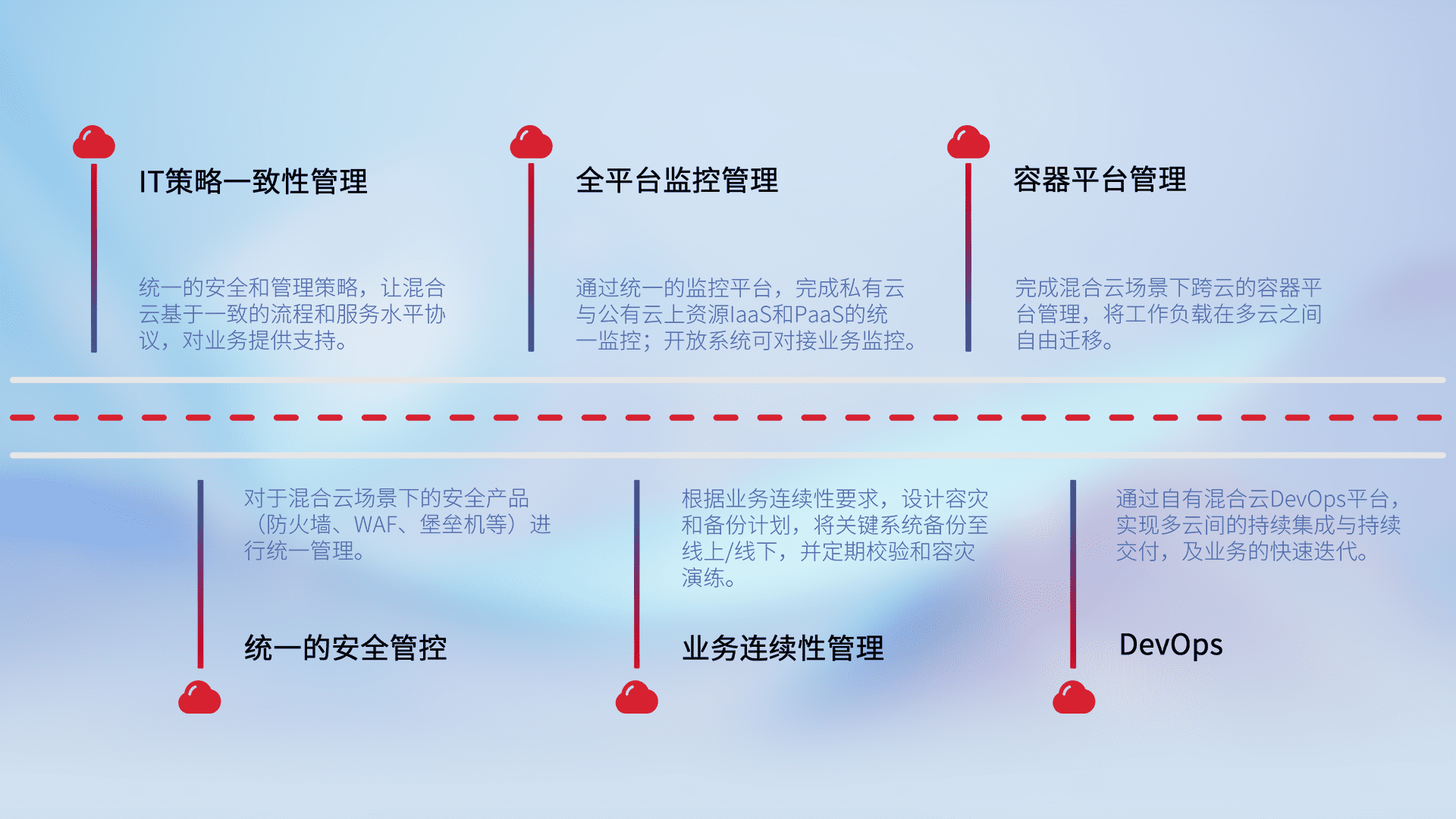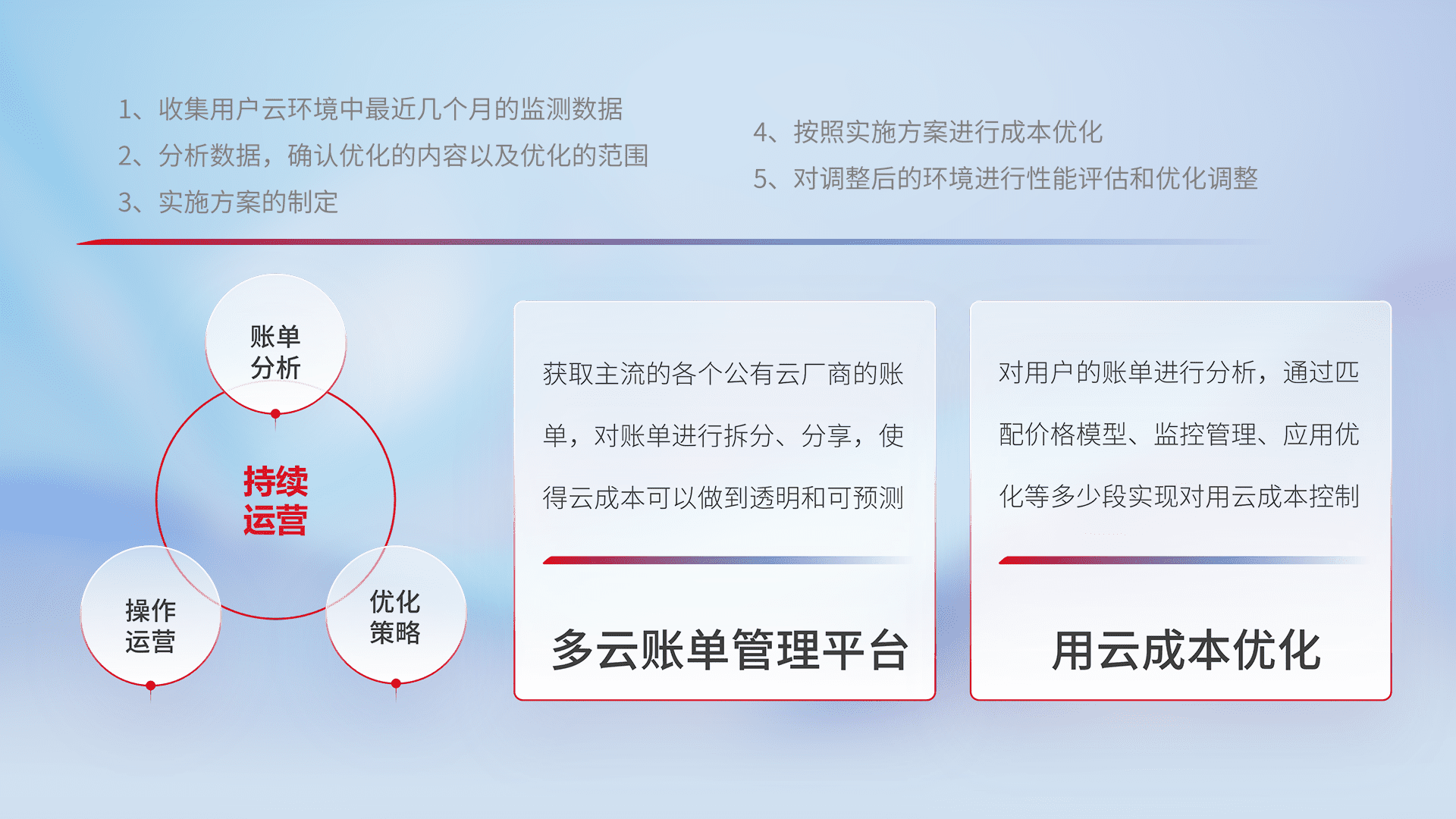 通过多云纳管,,,,以统一的资源数据模型把客户的云资源进行抽象和封装,,,进而实现对多云资源的统一操作,,,,保障云资源管理的可靠性、、稳定性与可用性。。量身定制化运维内容,,,,配置、、、开发运维、、、补丁管理、、备份、、、监控、、、、认证和访问管理、、、、审计和日常巡检等,,保障在用云过程中的可靠度,,,稳定度以及高可用率。。。